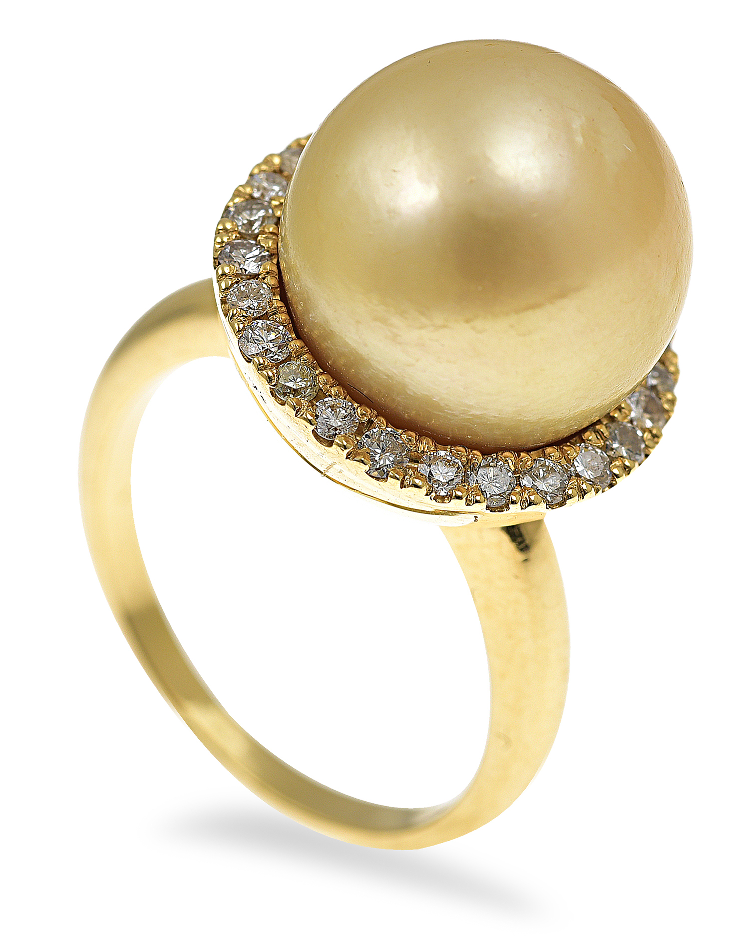 Centrally set with a near round pearl measuring 13.0mm, surrounded by round brilliant cut diamonds, mounted in 18ct gold, ring size N.