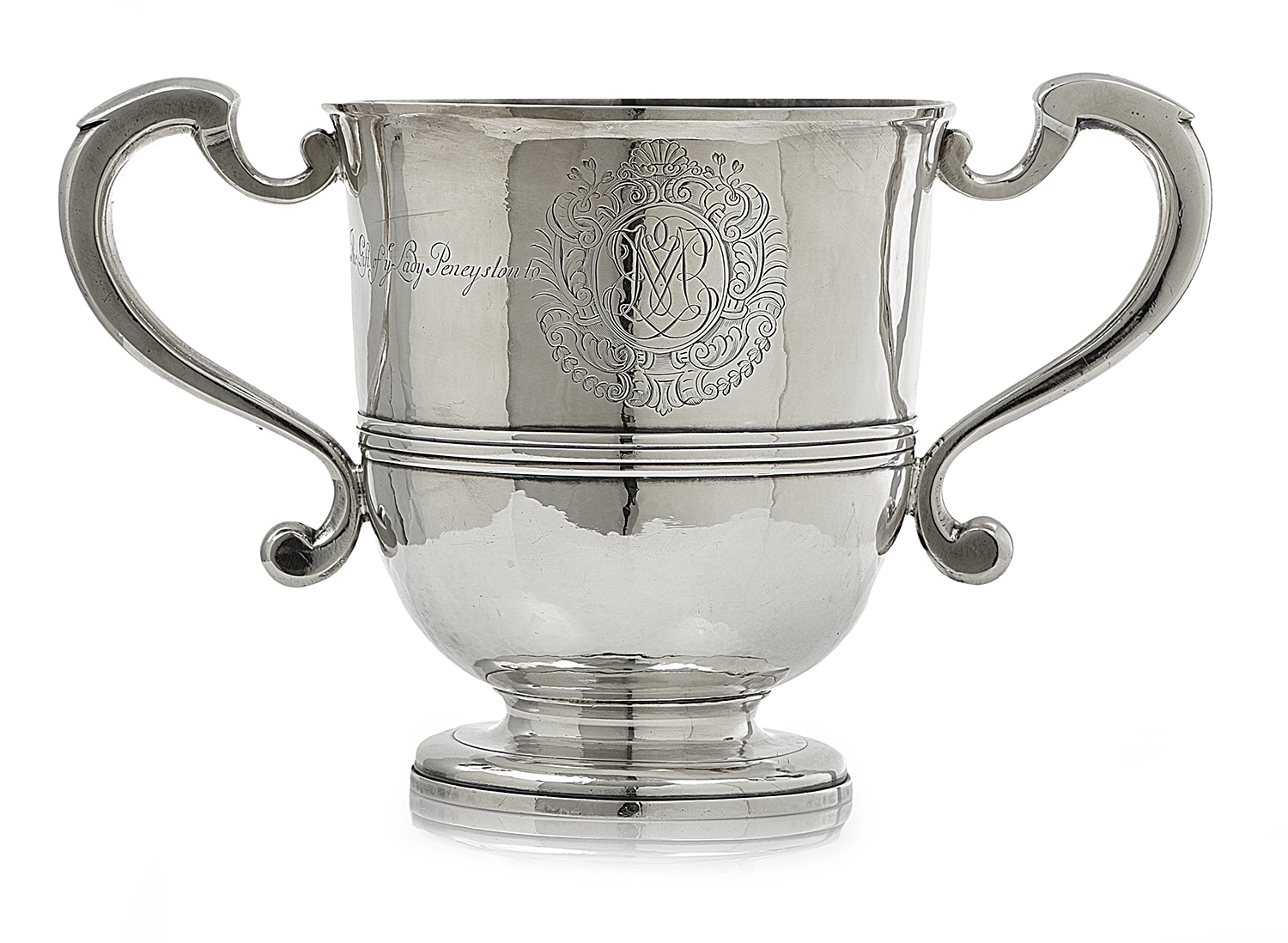 of deep cylindrical form, centred by a partial inscription 'The Gift of ye Lady Peneyston to ...' and a monogram and initials, with a girdle to the lower section, flanked by scroll handles, on a stepped circular foot, approximately 702gms, 14cm high