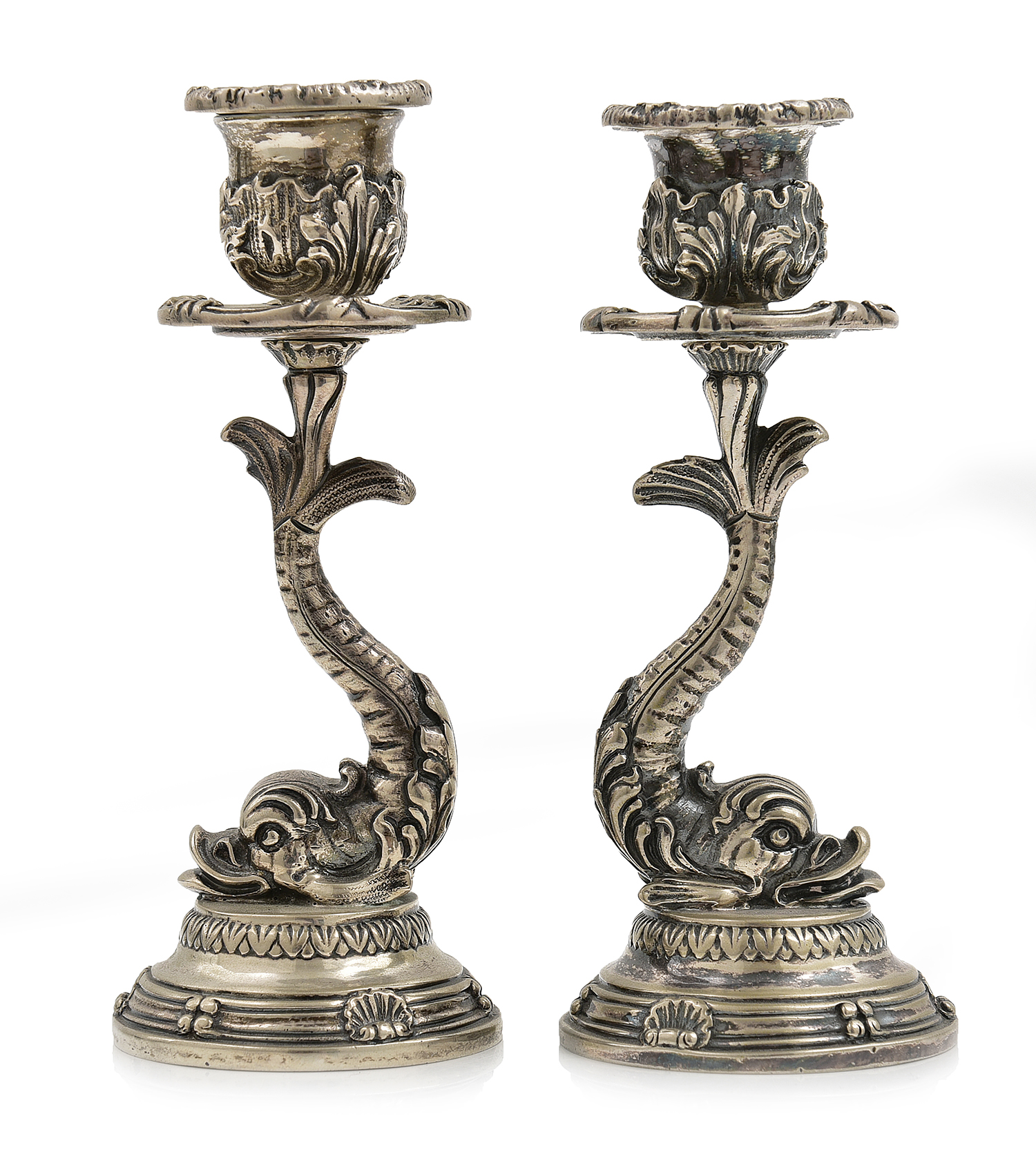 A PAIR OF 800 SILVER DOLPHIN CANDLE HOLDERS