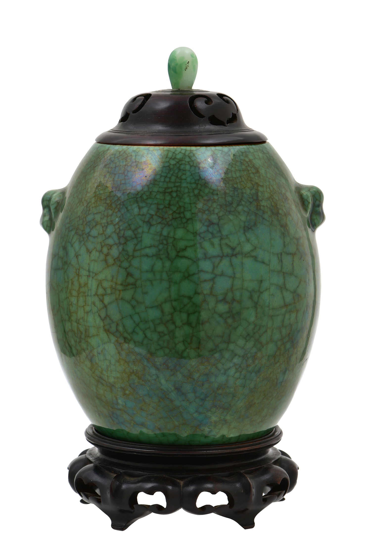 ovoid, with a monochrome apple green Ge-type glaze, rising to a hardwood cover inset with a hardstone finial, raised on a separate hardwood stand, the vase 19cm high including the finial, 22cm total height including the stand