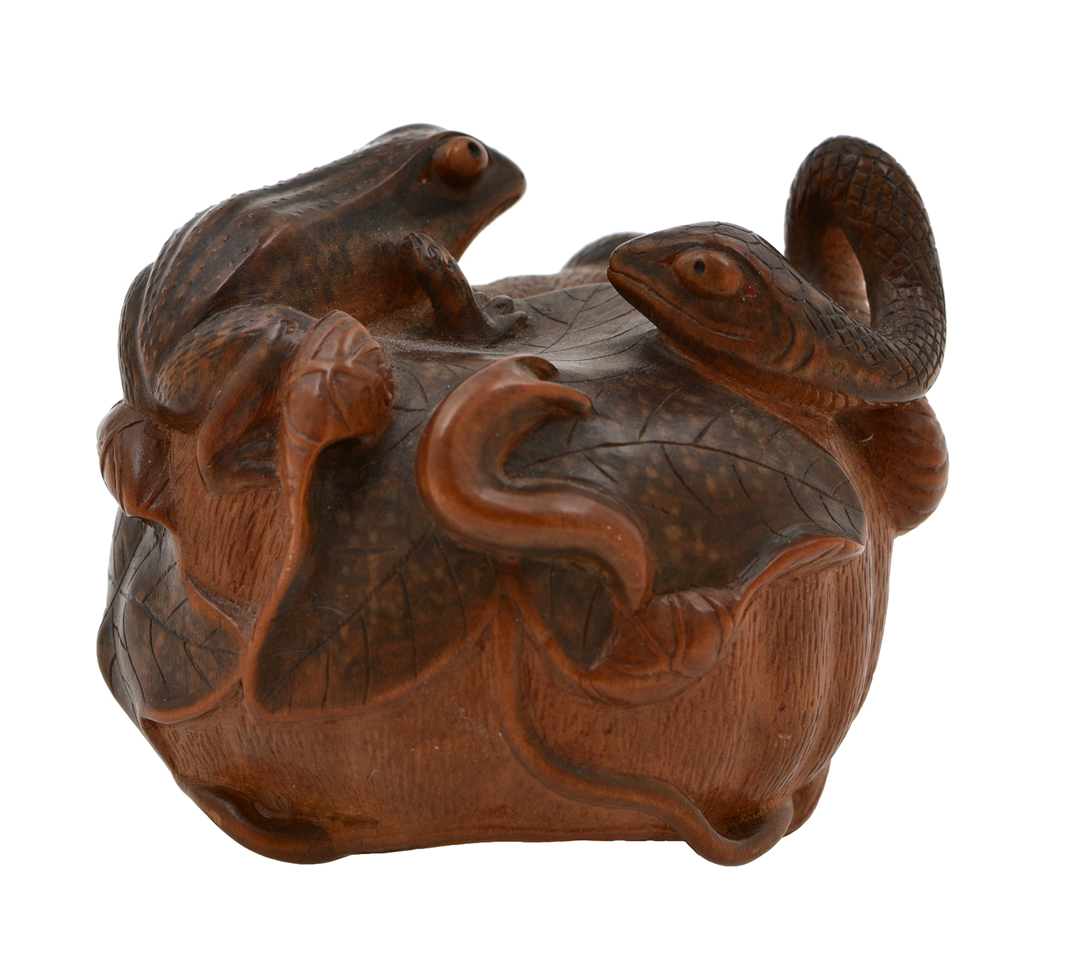 depicting a frog perched upon a pumpkin, a snake peering out from within, inscribed signature to the underside, 5.5cm wide