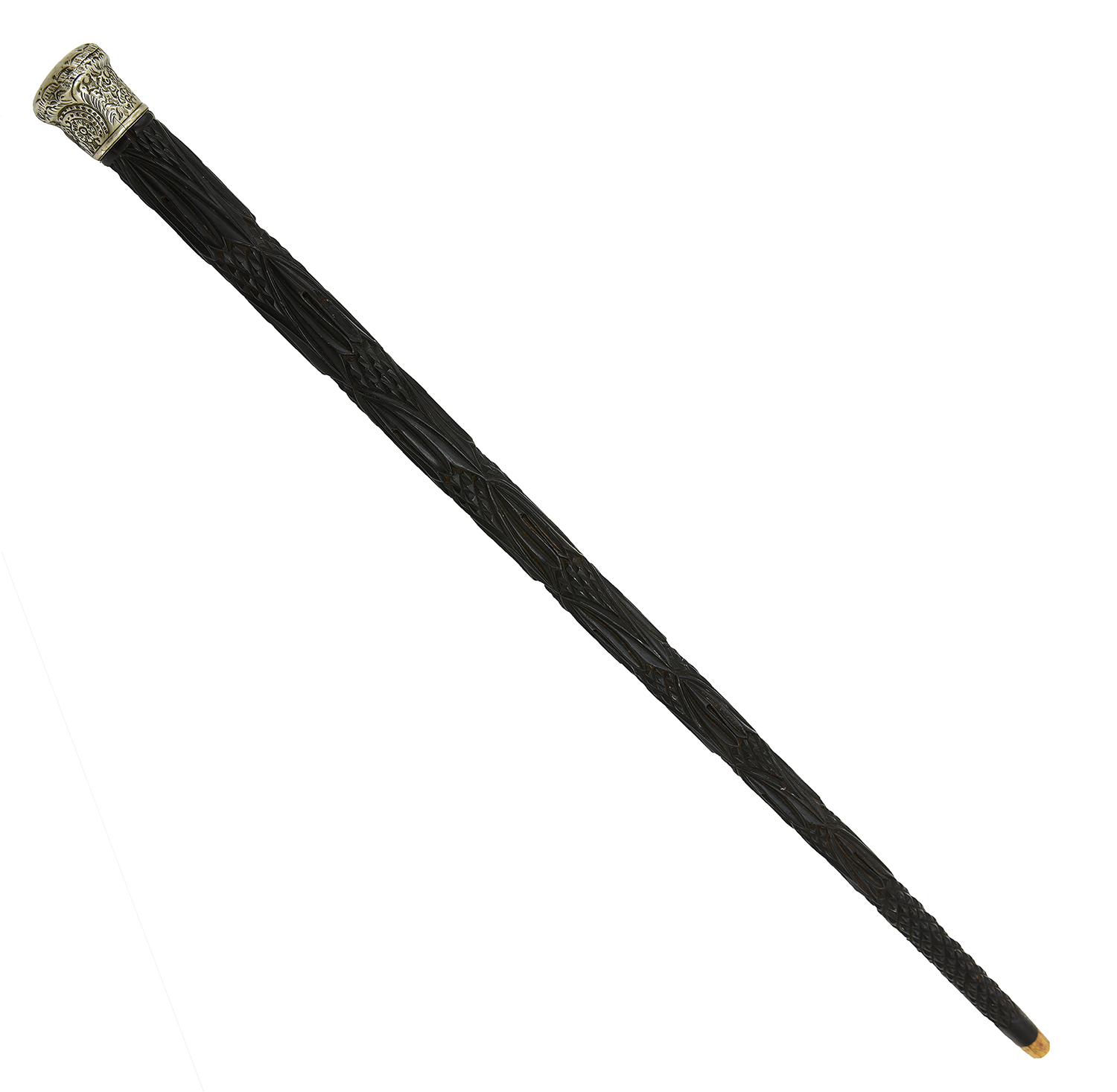 carved with a stylised leaf tip pattern, rising to a foliate embossed silver plate mount, terminating in an ivory tip, 85cm long