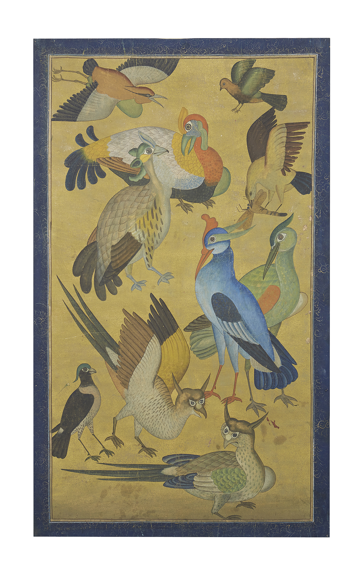 Depicting feeding birds, within blue border with gilded scrolls, later sewn onto canvas mount, 126 x 75cm