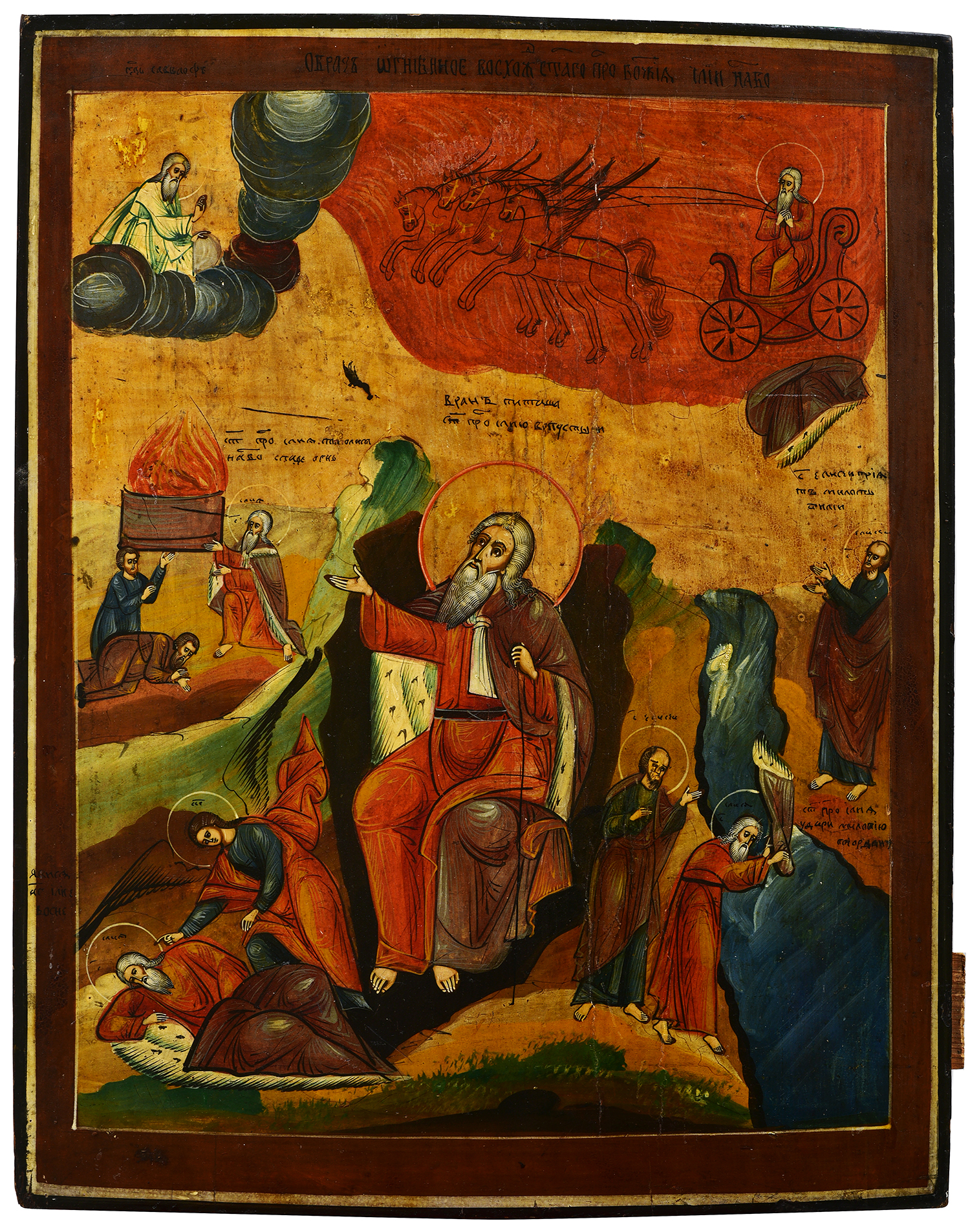 the icon depicts the prophet seated at center and surrounded with various scenes from his life, the upper part of the icon is the scene of the ascension of Prophet Elijah to heavens, 47 x 38cm