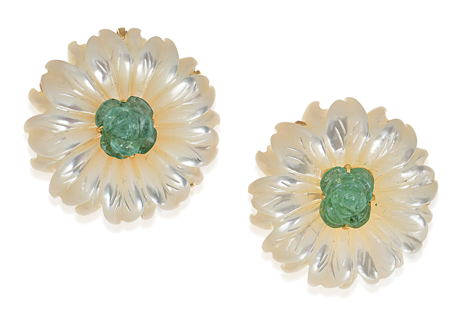 Each comprising a finely carved mother of pearl flower centred with a carved emerald, mounted in 14ct gold.