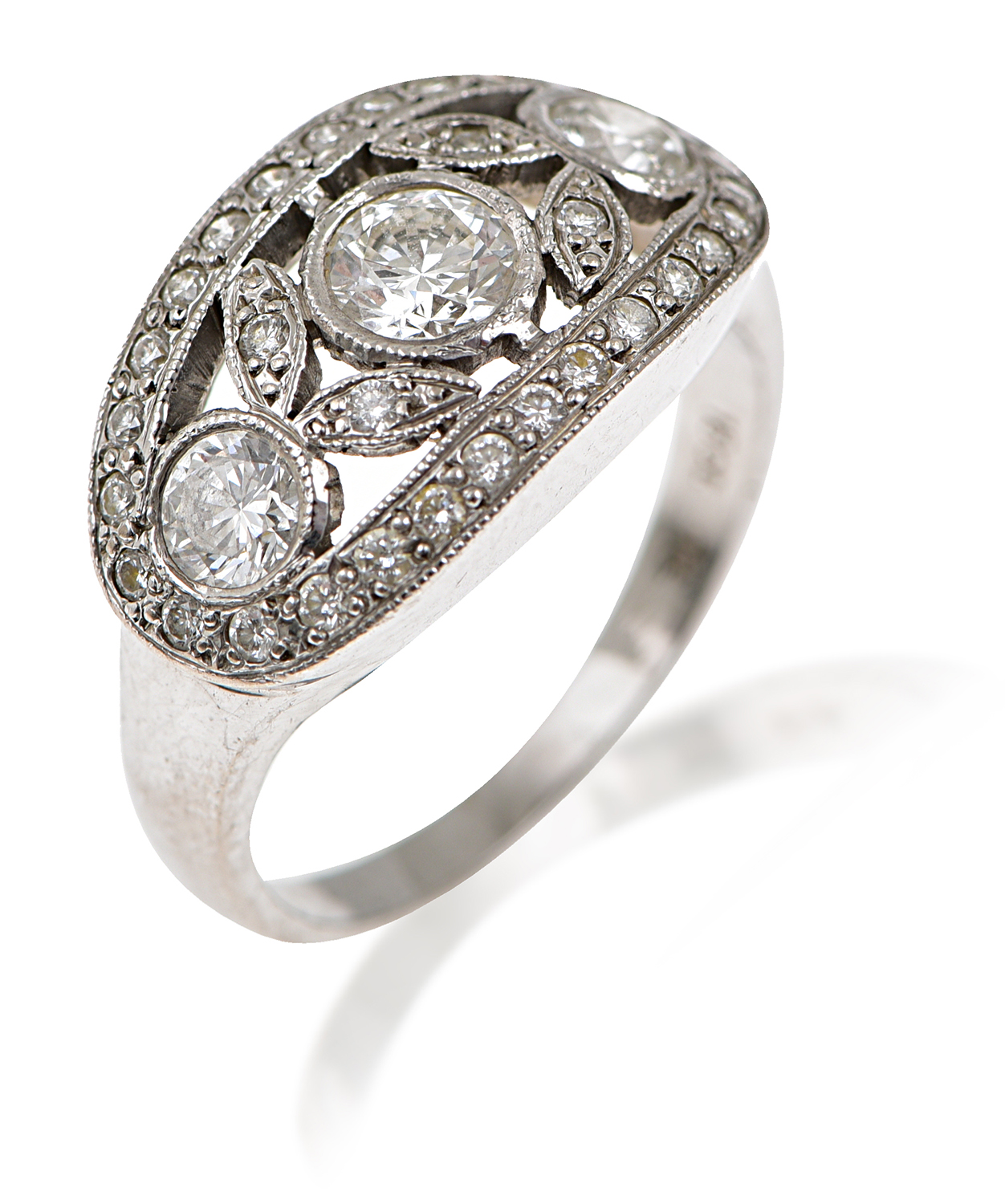The pierced plaque centrally set with a round brilliant cut diamond of 0.35cts, having further diamond detail throughout, grain set and mounted in 18ct white gold, signed Imp, ring size K-L.