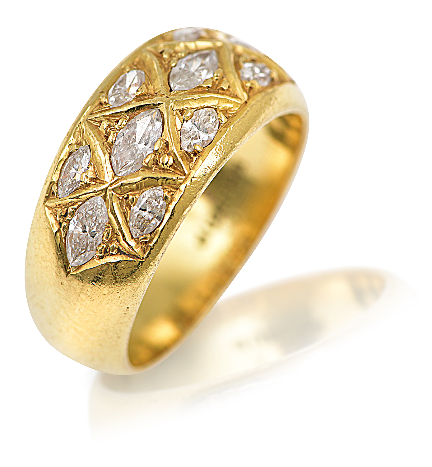 Comprising thirteen marquise cut diamonds horizontally set, mounted in 18ct gold, signed Imp, ring size N-O.