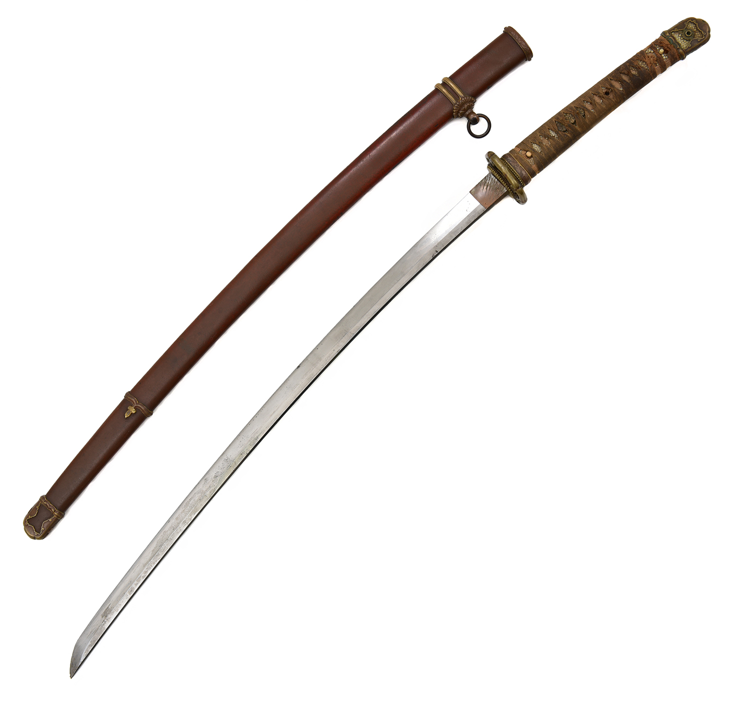 the tsuka overlaid in shagreen and robe bound, joining to a bronze tsuba, housed in a bronze mounted red lacquered saya