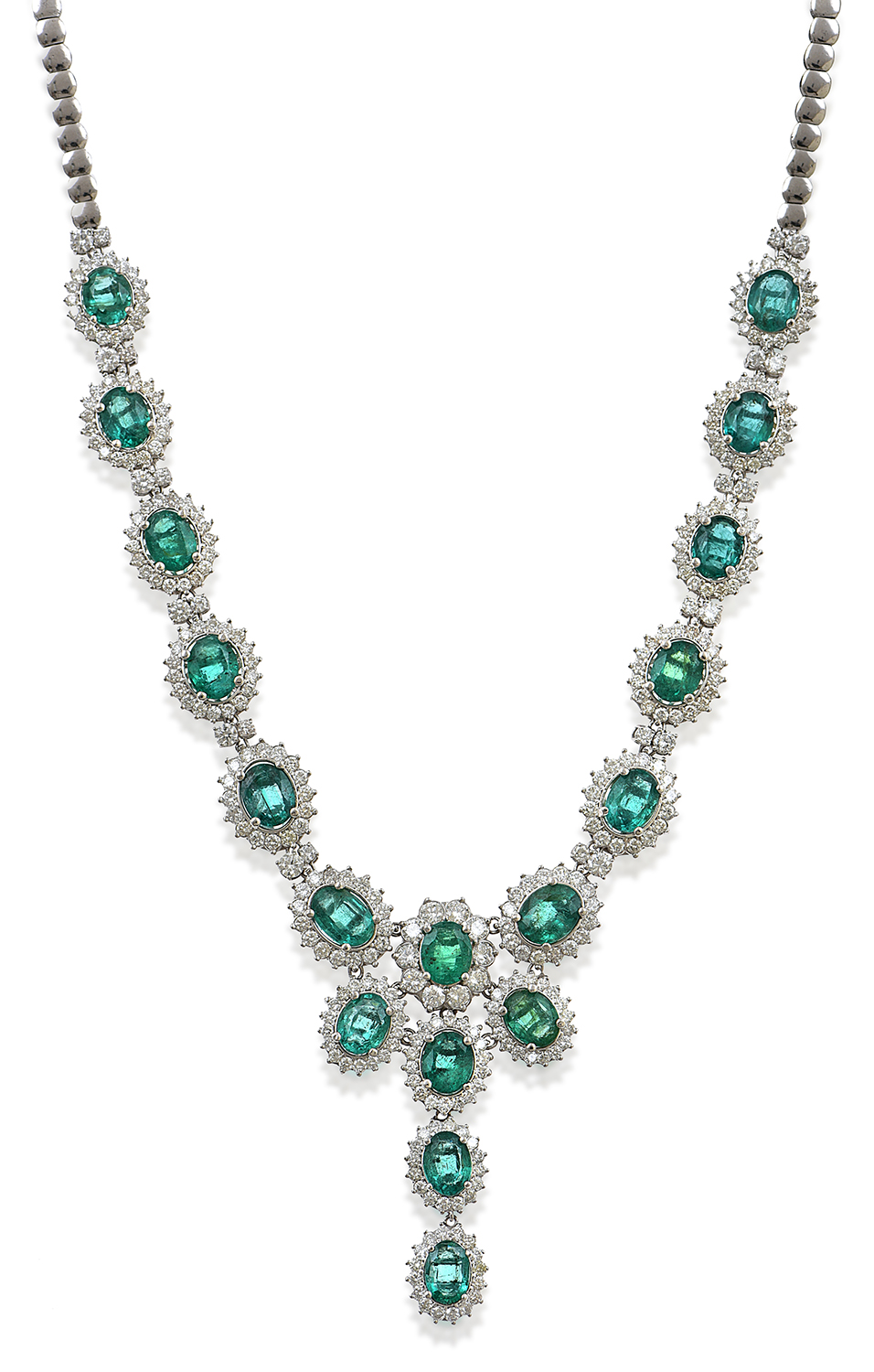 Centrally set with eighteen emerald and diamond cluster panels, the emeralds totalling 27.05cts and diamonds totalling 13.35cts, mounted in 18ct white gold, total length 460mm.