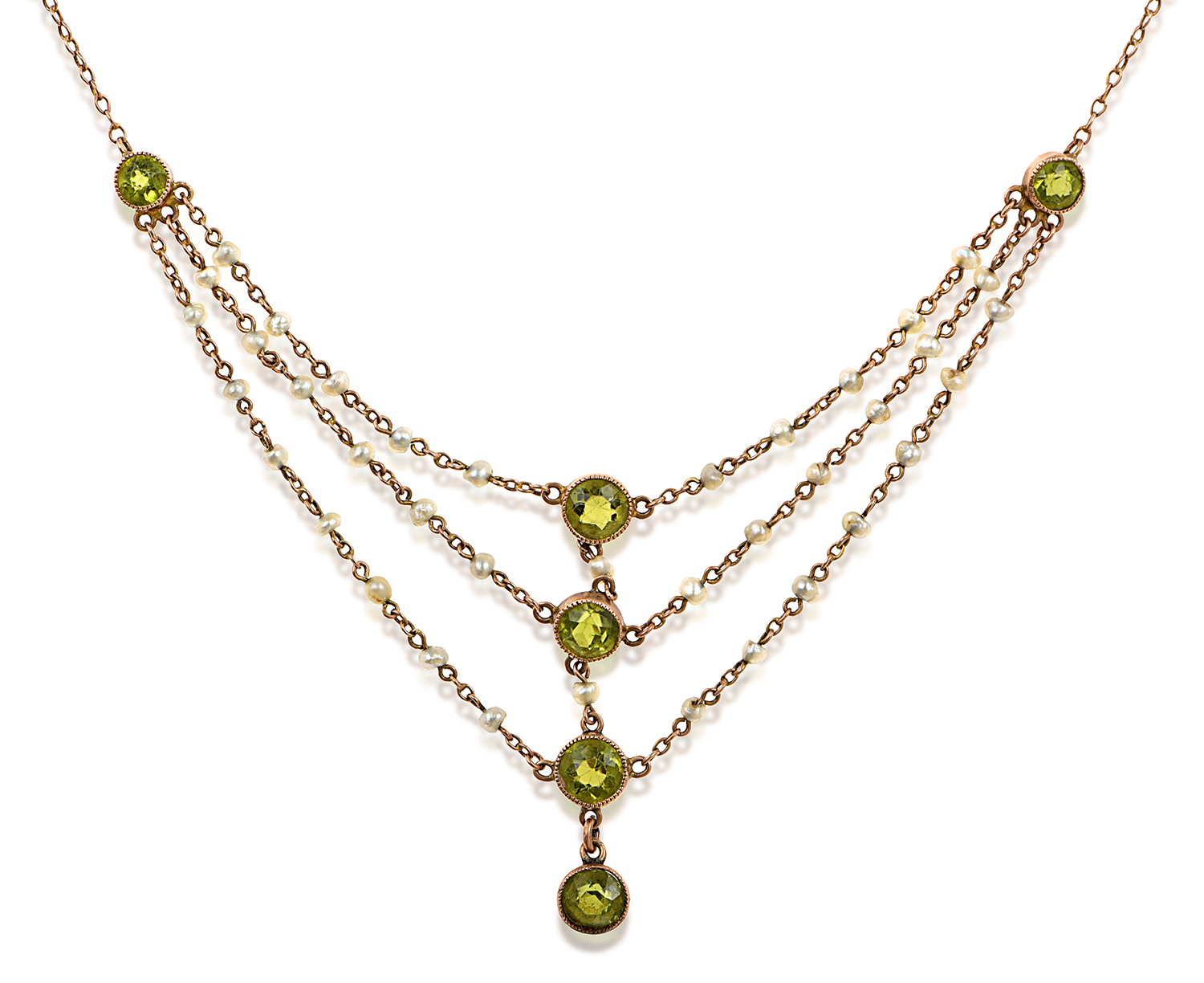 Featuring five round peridots offset by three rows of seed pearl festoons and finished with fine trace chain, mounted in rose gold, total length 450mm.