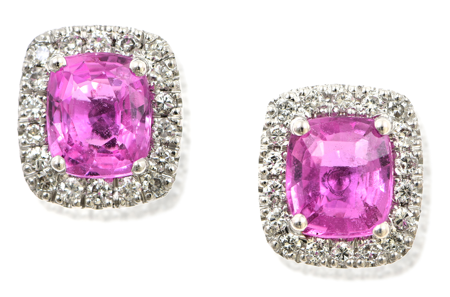 Centrally set with a cushion cut pink sapphire, surrounded by brilliant cut diamonds, mounted in 18ct white gold.