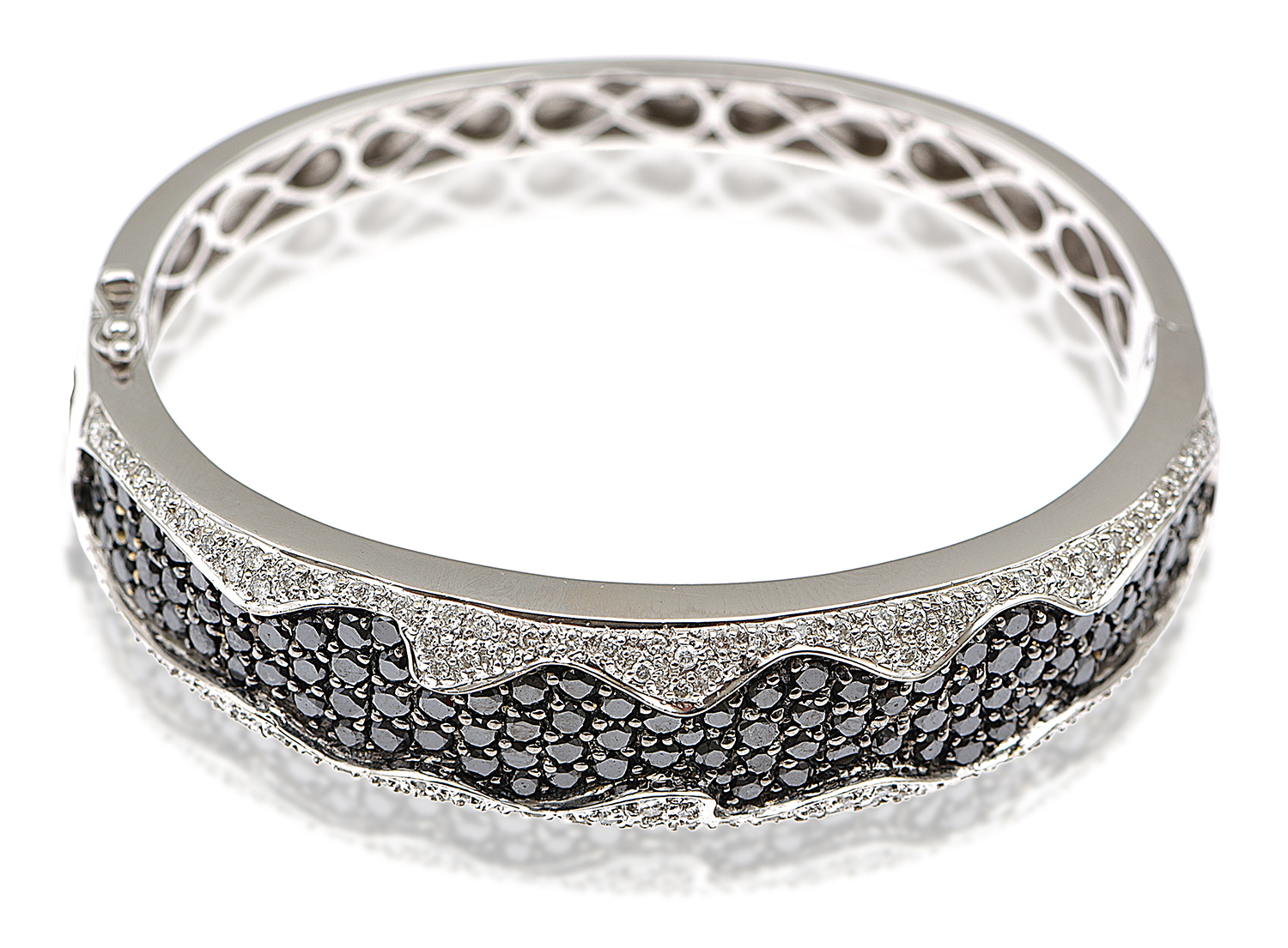 The oval hinged bangle featuring grain set round brilliant cut black diamonds in a wave formation highlighted by pave set white diamonds, mounted in 18ct white gold.