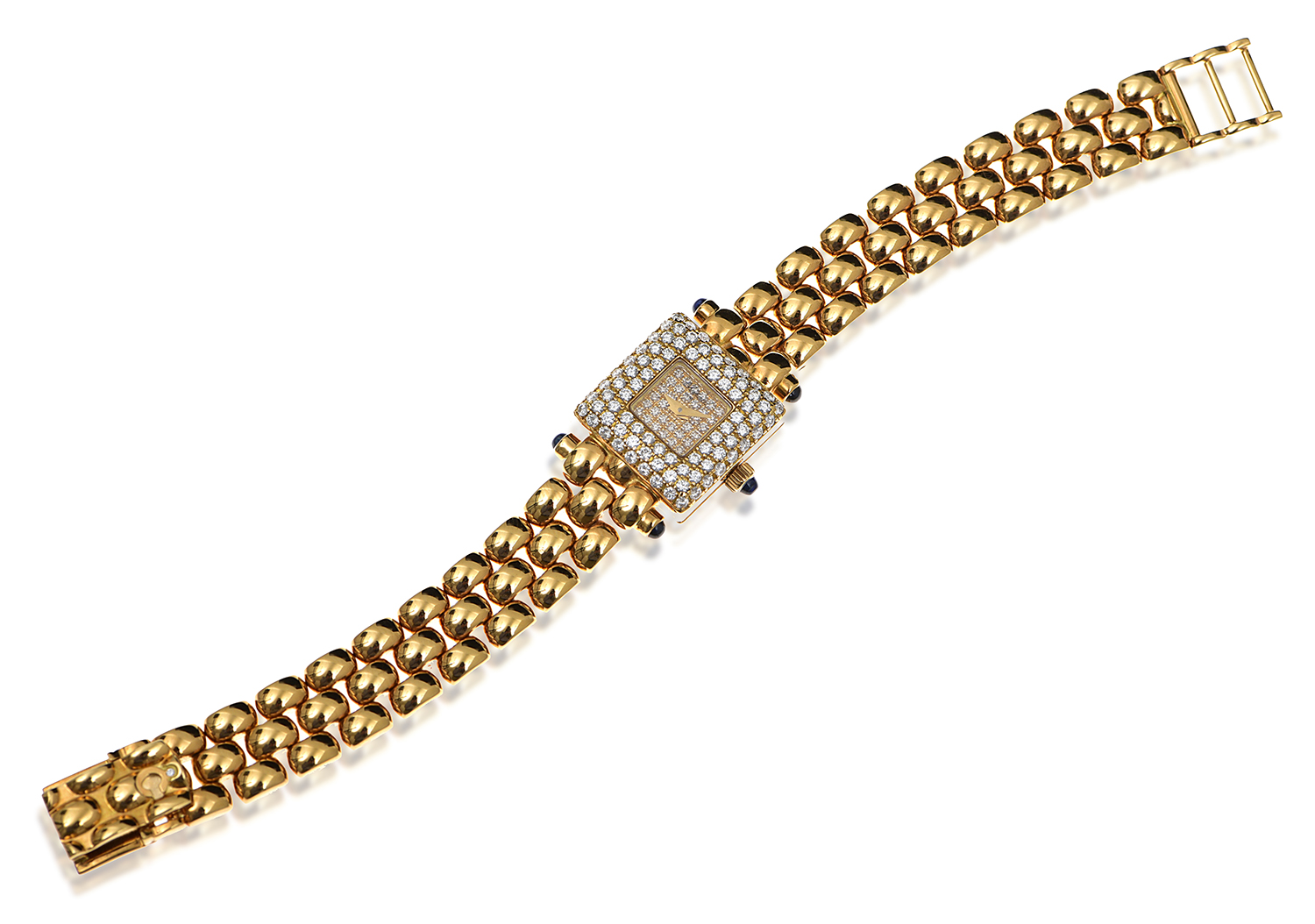 Manual wind movement, square diamond dial, signed case, dial and movement, 18ct gold case with pave set diamond bezel, sapphires set to the crown and lugs, 18ct gold brick link bracelet bands, total length 150mm, case length 20mm.