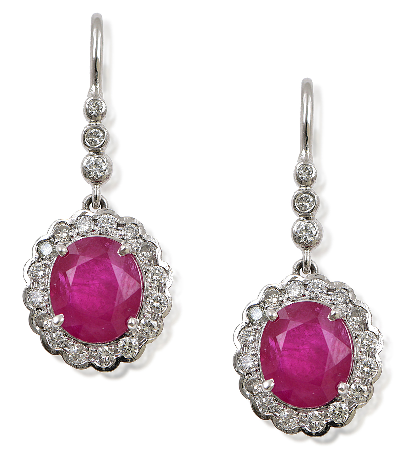 Each centrally set with an oval cut ruby of 3.34cts, surrounded by round brilliant cut diamonds, mounted in 18ct white gold.