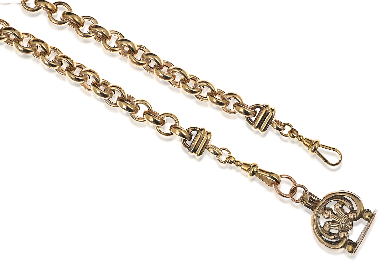 The belcher link chain fitted with two swivel clips and terminating in a pierced seal, all mounted in gold, total length 650mm.