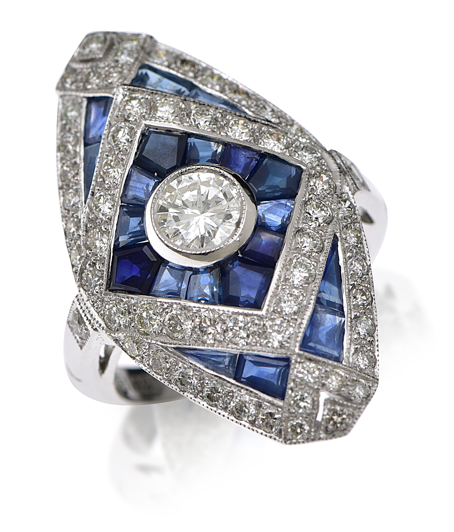 Centrally set with a round brilliant cut diamond of 0.50cts, within a plaque setting of carre cut sapphires and round brilliant cut diamonds, mounted in 14ct white gold, ring size L.
