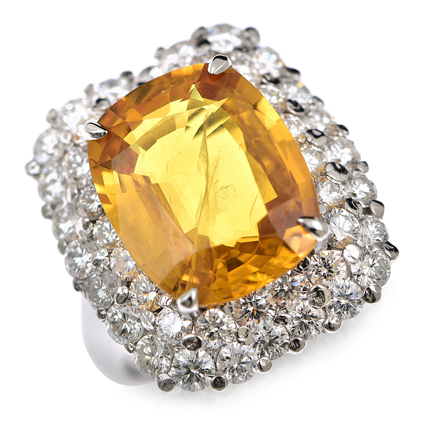 Centrally set with a cushion cut yellow sapphire, surrounded by round brilliant cut diamonds, mounted in 18ct white gold, ring size M.