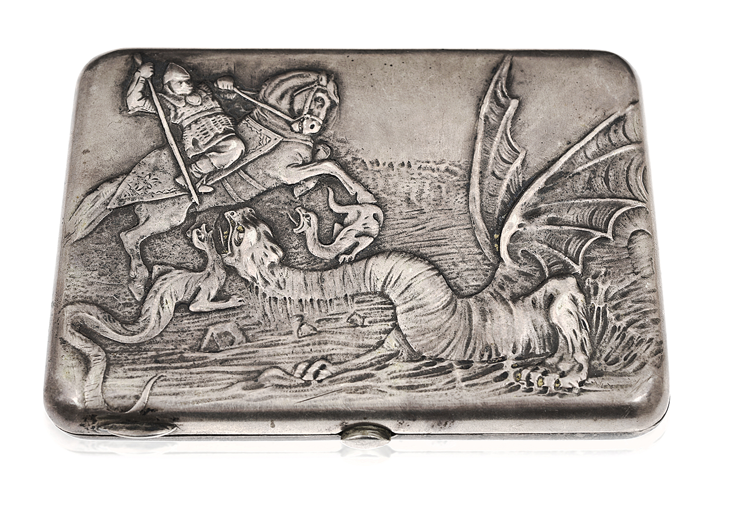 The rectangular hinged case having elaborate chased decoration depicting St George and the dragon, Russian marks, total length 110mm.