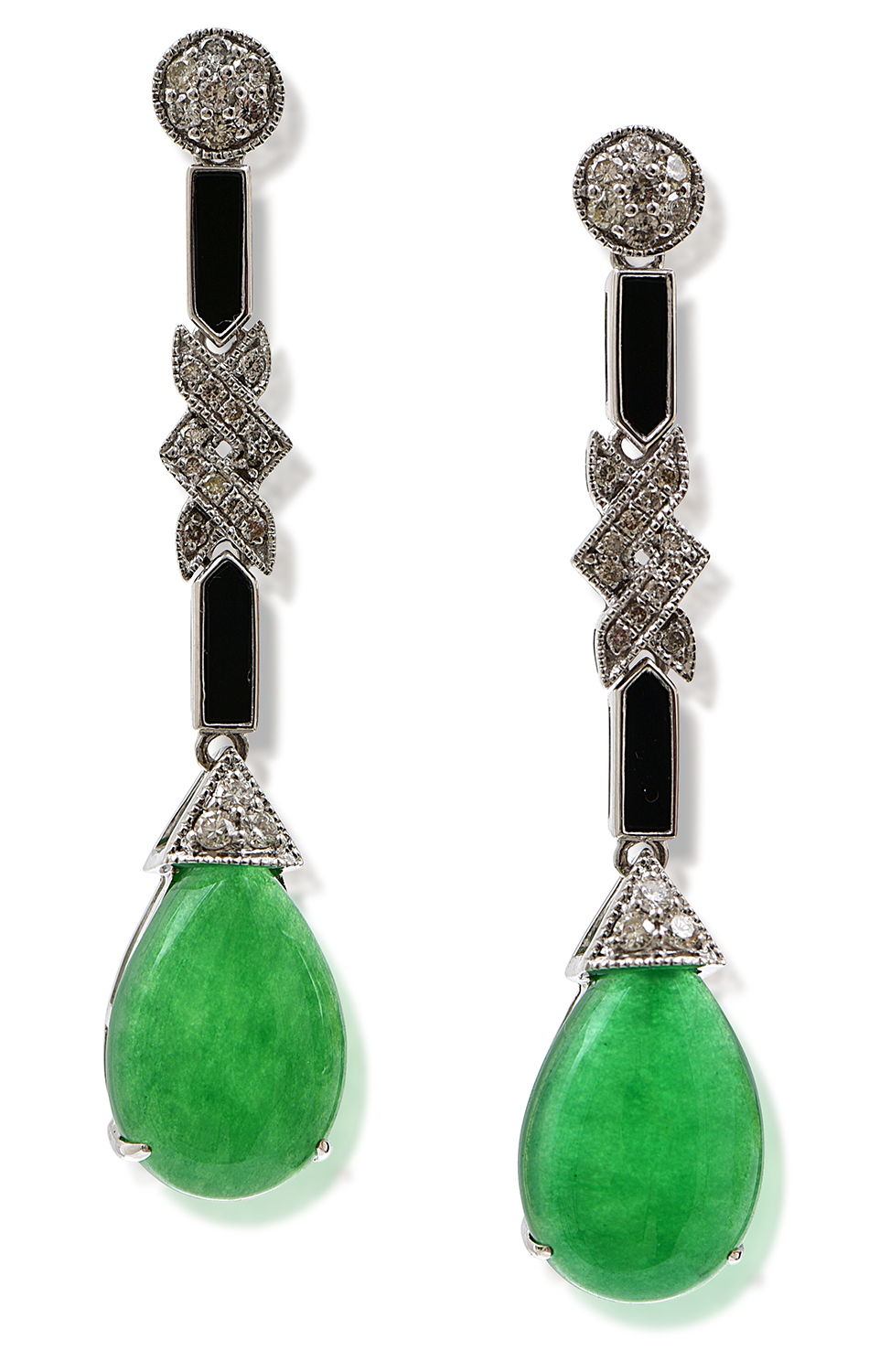 Each earring set with a pear shaped jadeite cut en cabochon surmounted by round brilliant cut diamonds and onyx, mounted in 18ct white gold.