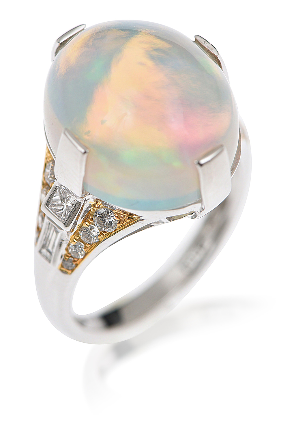 Centrally set with a solid jelly opal cut en cabochon of 10.36cts with round brilliant, princess and baguette cut diamond set shoulders, mounted in 18ct white and yellow gold, ring size N.