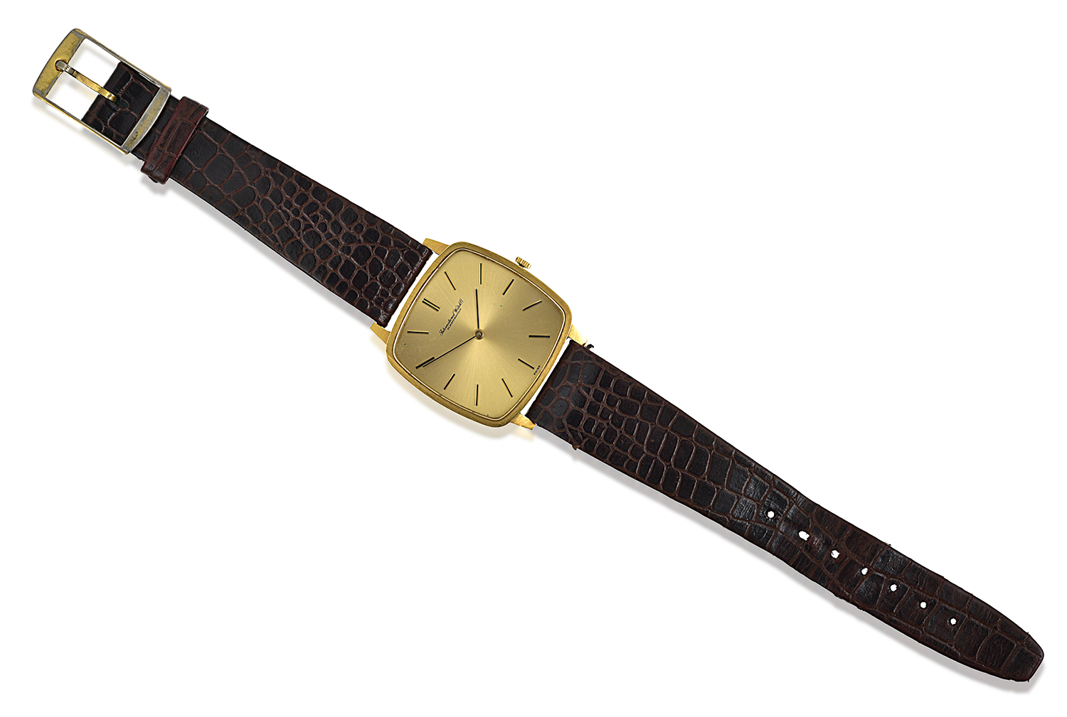 Manual wind movement, square gold dial with applied baton numerals, signed case, dial and movement, 18ct gold case and brown leather bands, 30mm square.
