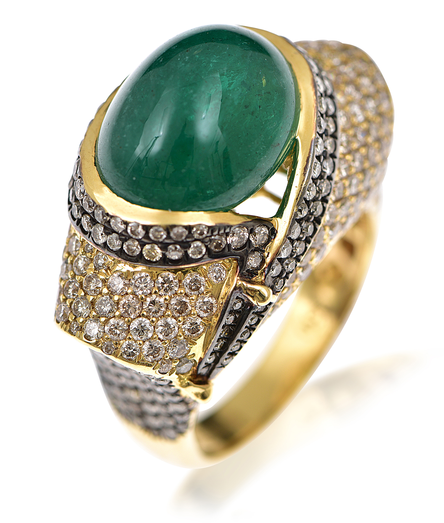 Centrally set with an oval emerald cut en cabochon weighing 8.75cts, surrounded by pave and grain set white and coloured diamonds totalling 3.45cts, mounted in 18ct yellow and oxidised gold, ring size O.