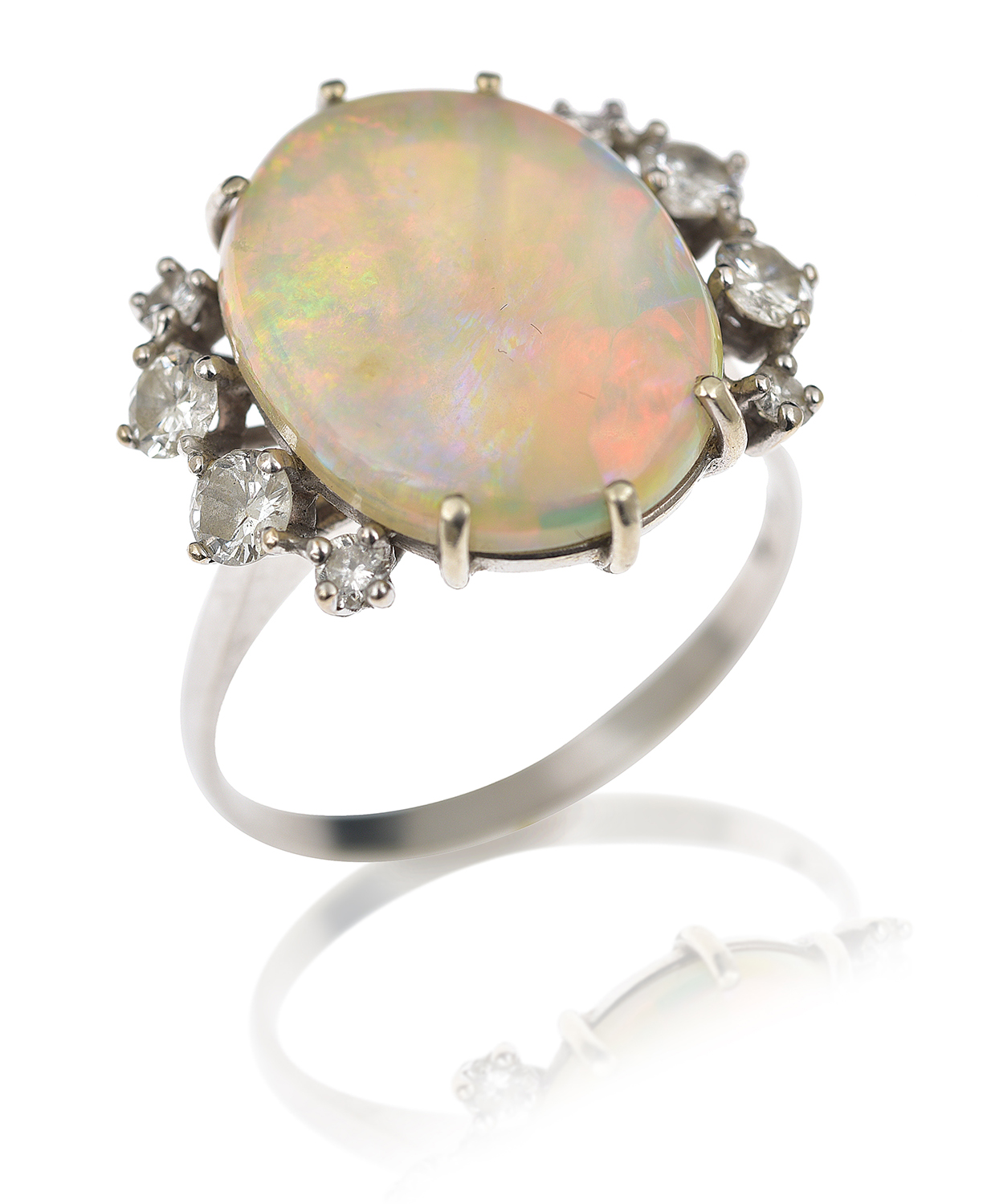 Ring presents in good condition. Opal is slightly loose in setting. Diamonds are colour G-H, clarity SI. Opal displays good play of colour with flashes of green, blue and orange