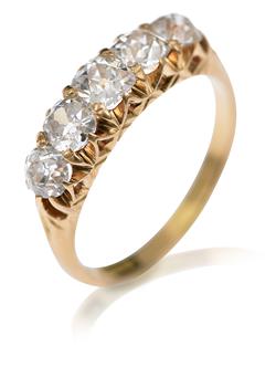 Featuring five old European cut diamonds totalling 1.30cts set in a pierced half hoop design, all mounted in 18ct gold, signed, ring size K - L, with original signed box.