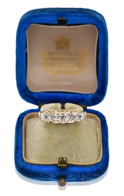 Ring presents in excellent condition. Stones appear secure in their settings. Diamonds are colour H, clarity SI-P. One stone has a chip underneath a claw.