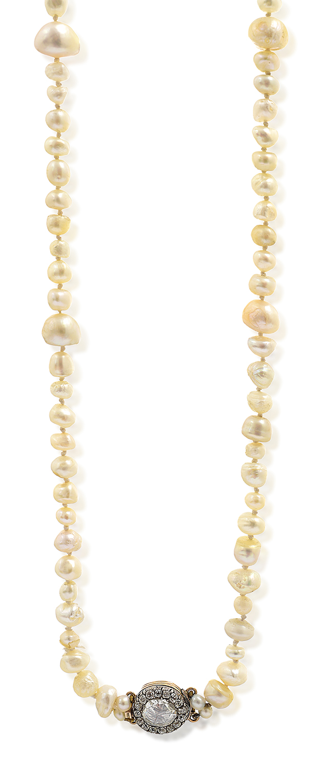 Comprising 249 baroque pearls of white and cream hues measuring 4.50mm to 9.45mm, knotted to two small seed pearls at each end and finished with a diamond set clasp, featuring a rose cut diamond measuring 7.70mm x 6.60mm surrounded by sixteen old mine cut diamonds set in 15ct gold, total length 1320mm.