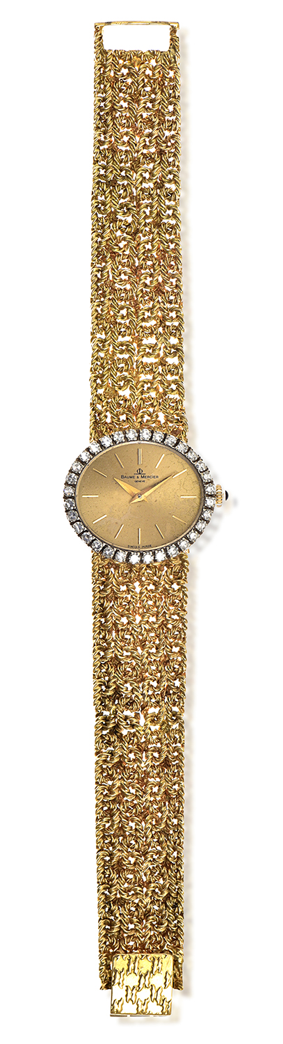 Manual wind movement, oval gold dial with baton numerals, signed case, dial and movement, 18ct gold case with diamond set bezel and woven bands, total length 165mm, 24mm diameter.