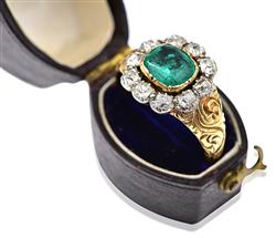 Featuring an oval cut emerald of 1.05cts, surrounded by old mine cut diamonds in crimped settings, to finely carved and engraved shoulders, mounted in 18ct gold and silver, ring size Q.