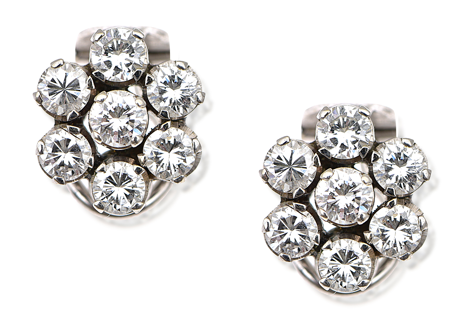Each earring set with seven round brilliant cut diamonds totalling 0.90cts, mounted in platinum, to clip fittings.