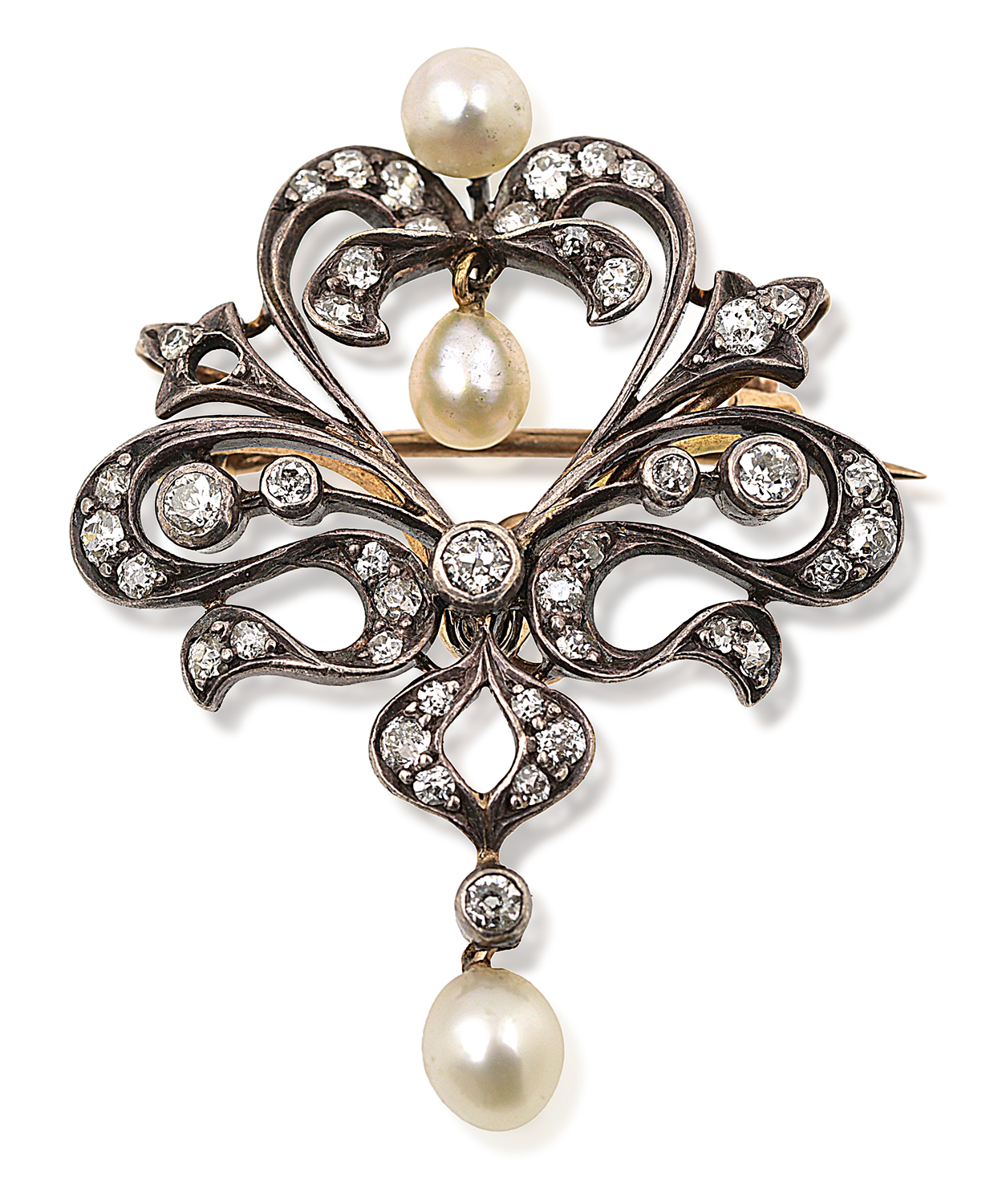 The pierced scroll frame set throughout with round mixed cut diamonds and offset with three seed pearls, mounted in 15ct gold and silver, signed Hardy Brothers Sydney.