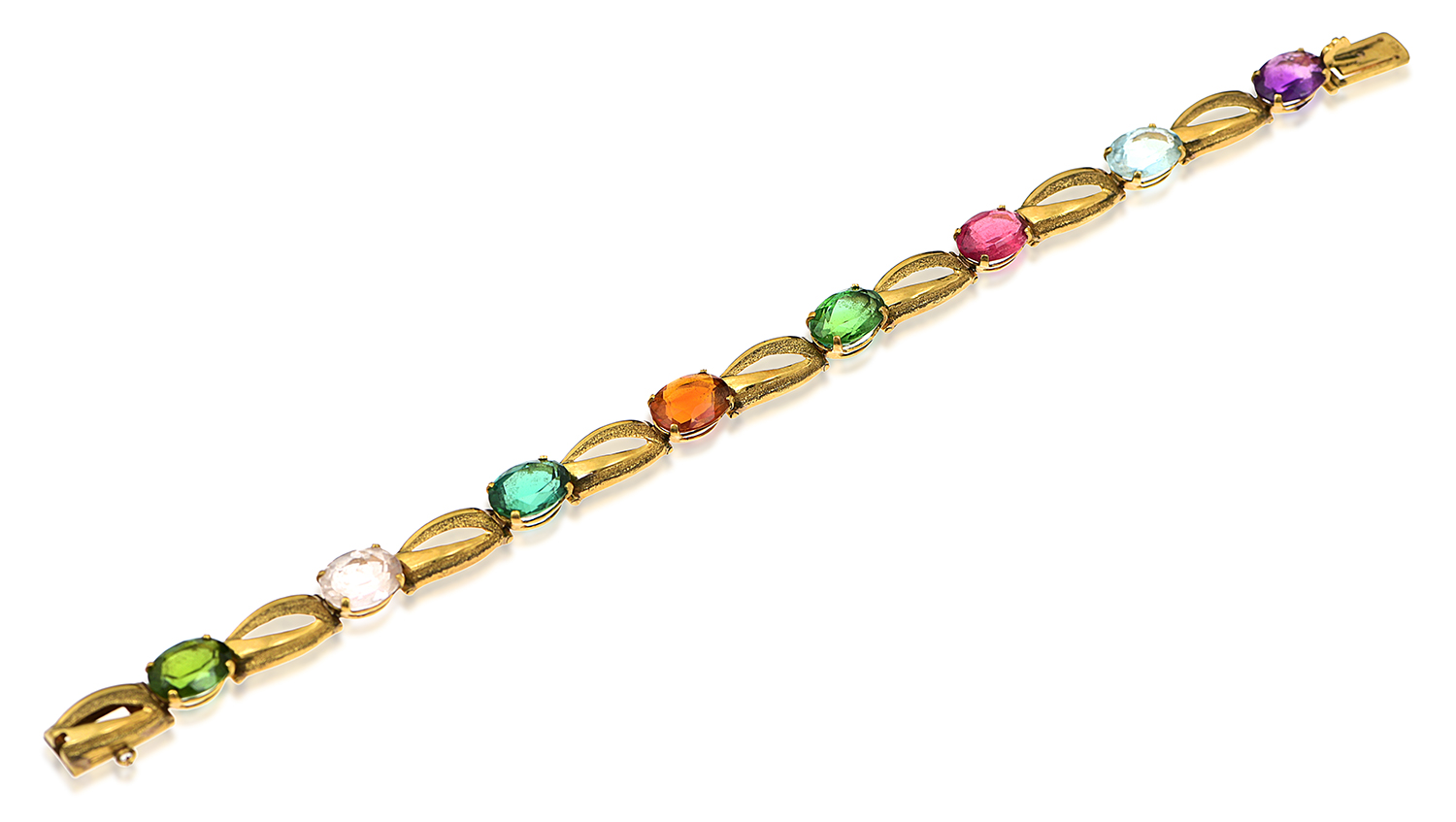 Featuring eight multi-coloured oval cut stones interspaced by pierced geometric panels, mounted in 18ct gold, total length 185mm.