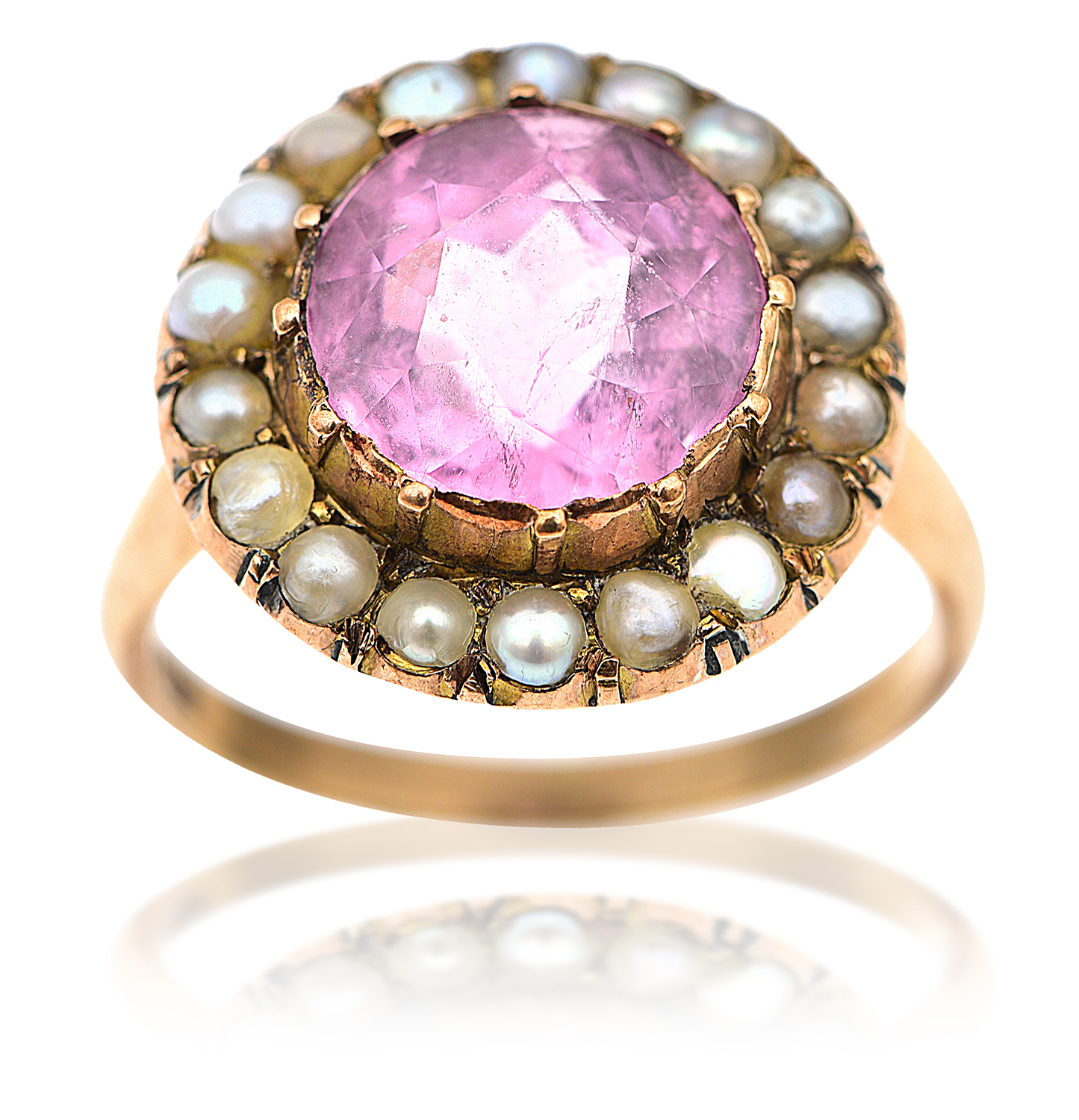 The round brilliant cut pink tourmaline of 4.00cts surrounded by a row of seed pearls, all mounted in gold, ring size M.