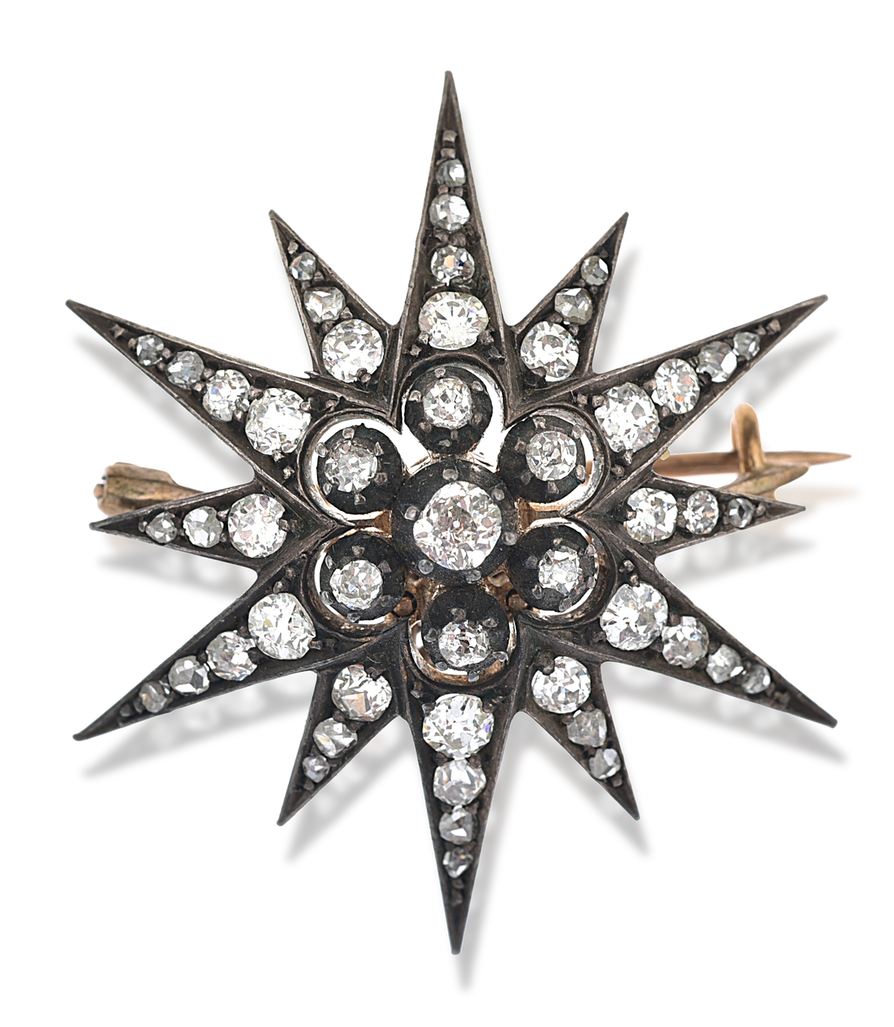 Featuring a central flower cluster set with old mine cut diamonds, offset by twelve diamond set rays of alternating lengths, all mounted in silver and gold.