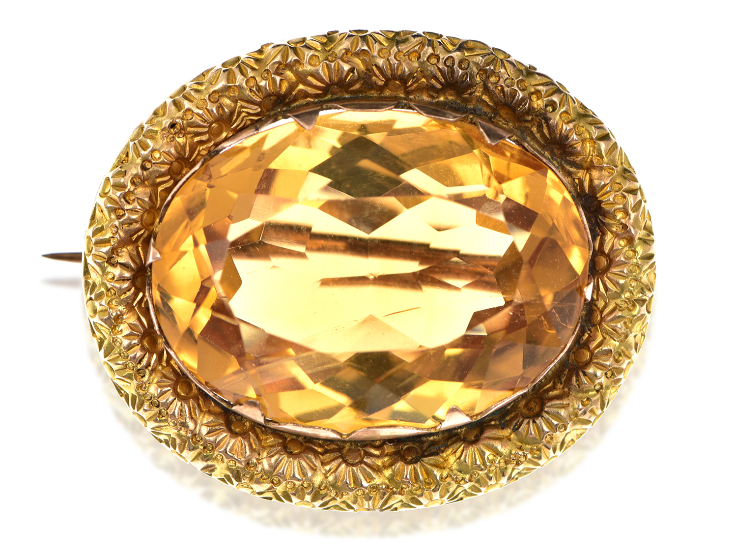 The oval cut citrine of 25.55cts mounted in a chased gold frame.