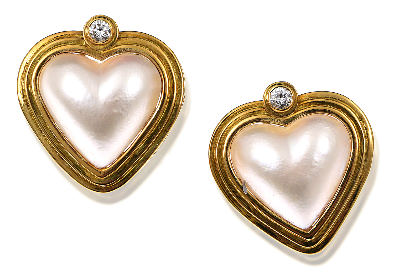 Each heart shaped mabe pearl set in a reeded frame and surmounted by a round brilliant cut diamond, all mounted in 18ct gold, hallmarked and signed.
