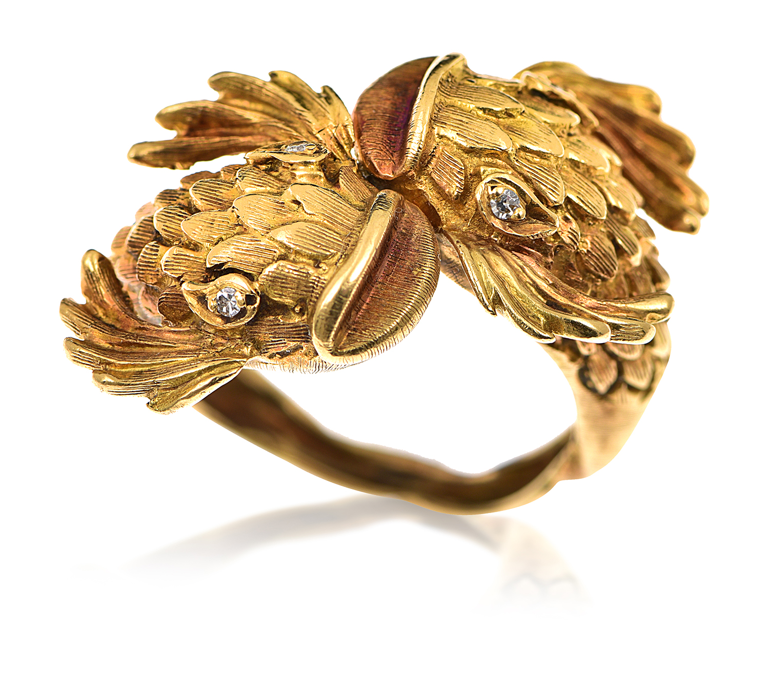 Modelled as two entwined koi fish with diamond set eyes, applied makers mark 750-A-21, mounted in 18ct gold, ring size O.