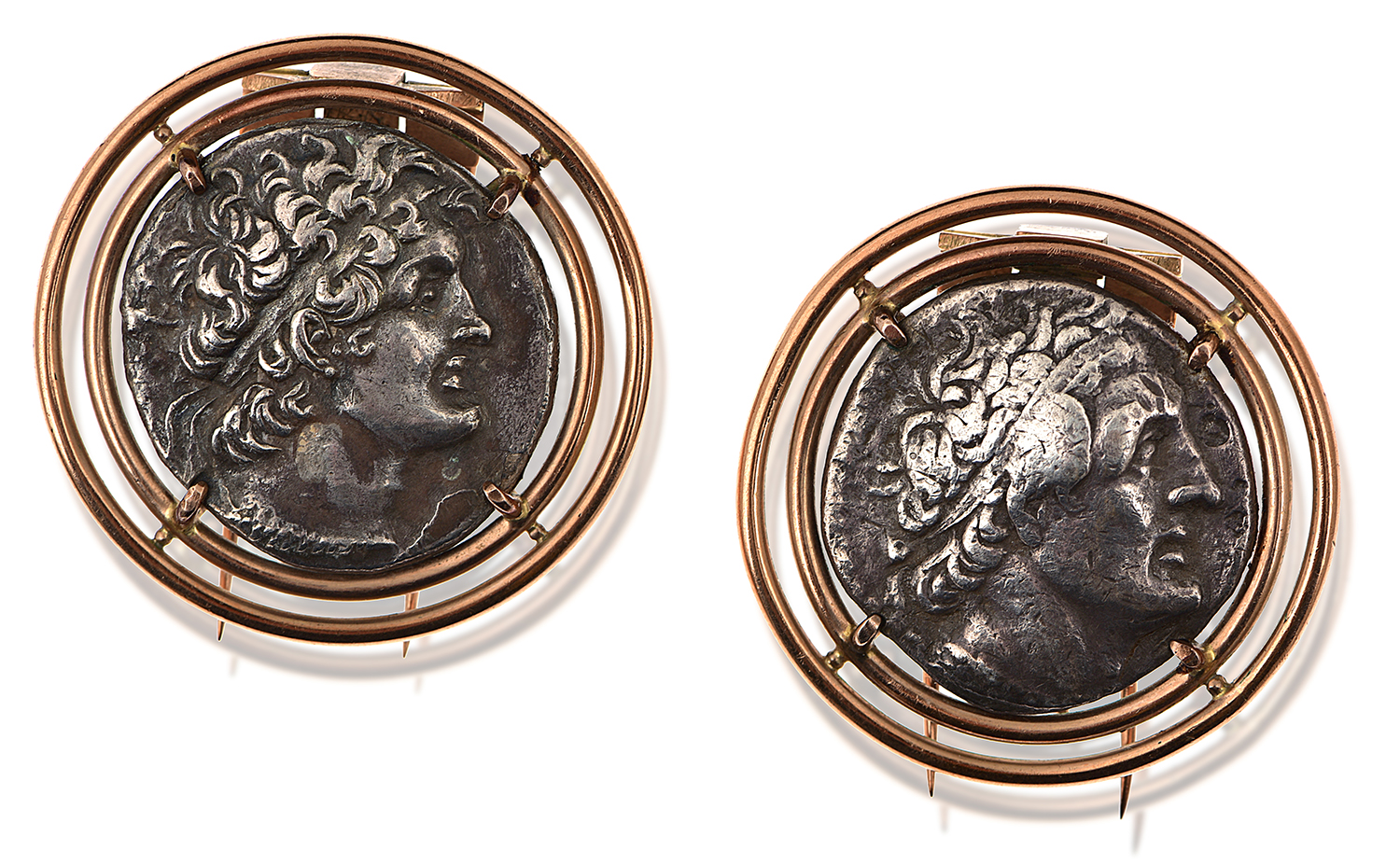 Each set with a silver Ancient Roman coin mounted in a pierced rose gold frame.