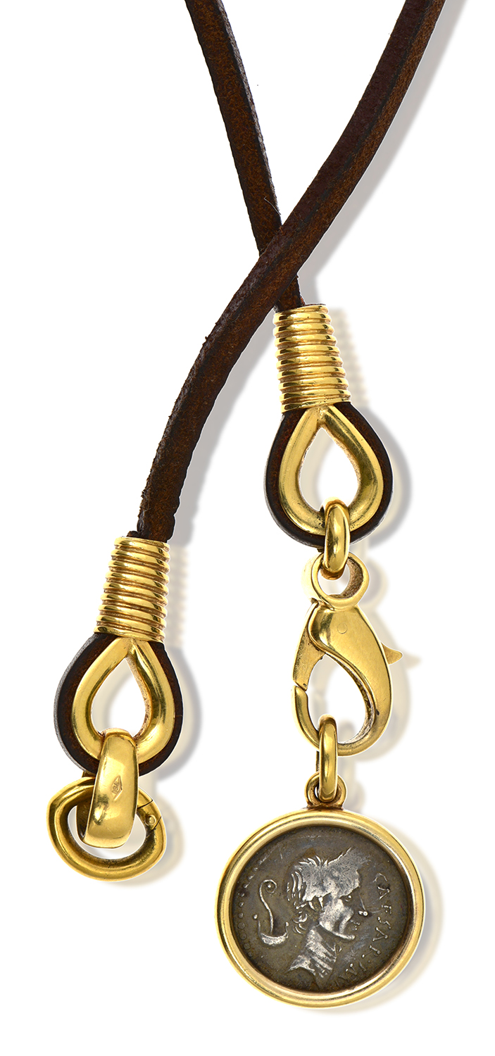 Featuring a silver Roman coin set in a gold frame and suspended from gold hardware and finished in brown leather, all mounted in 18ct gold.