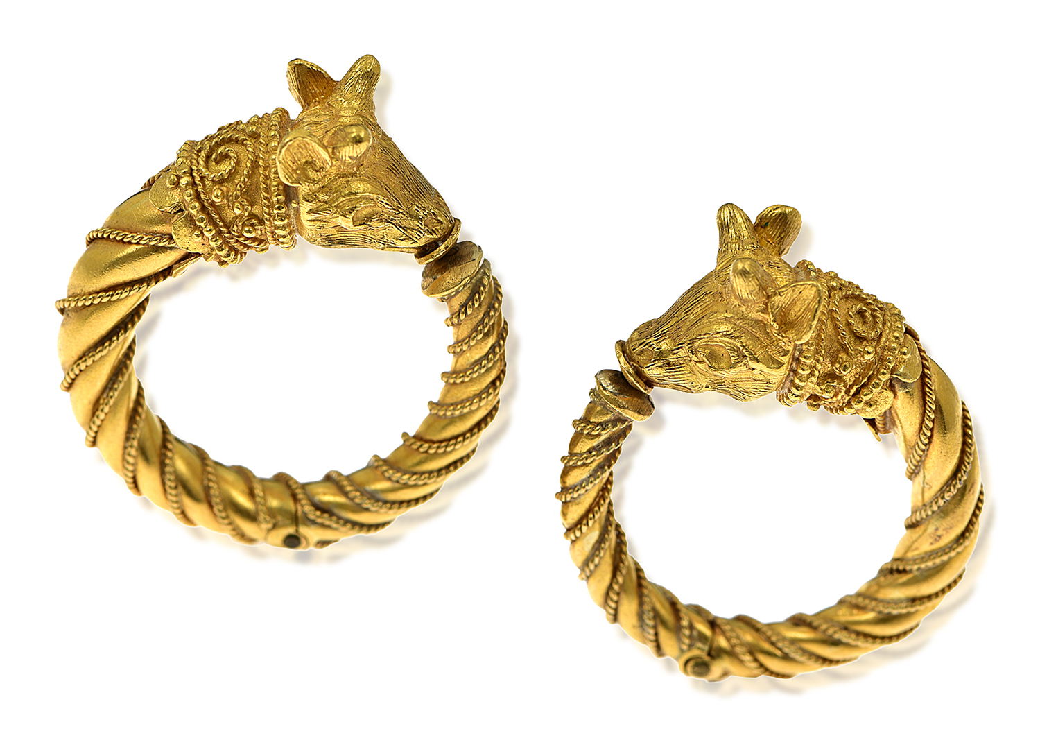 Each circular hinged earring modelled as a rams head, with rope twist detail throughout, mounted in 22ct gold.