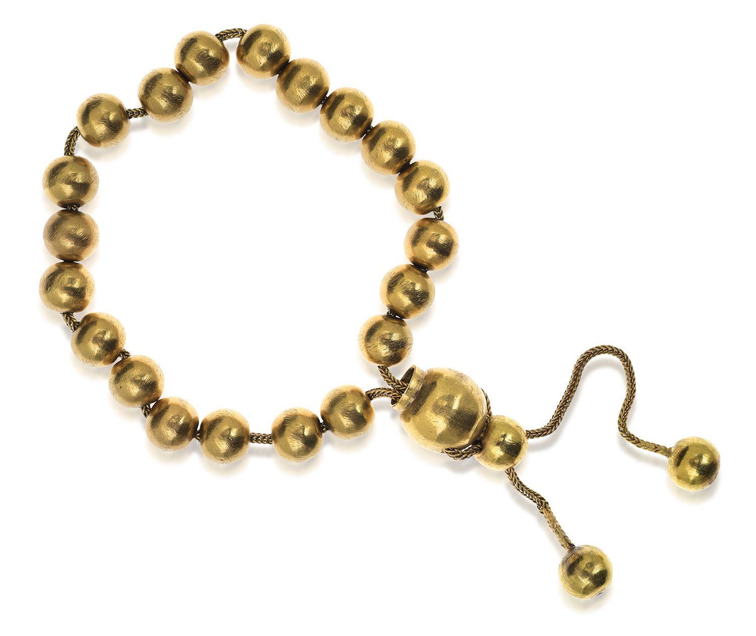 Comprising polished gold roundels suspended on a foxtail link chain with an adjustable clasp, mounted in 18ct gold.