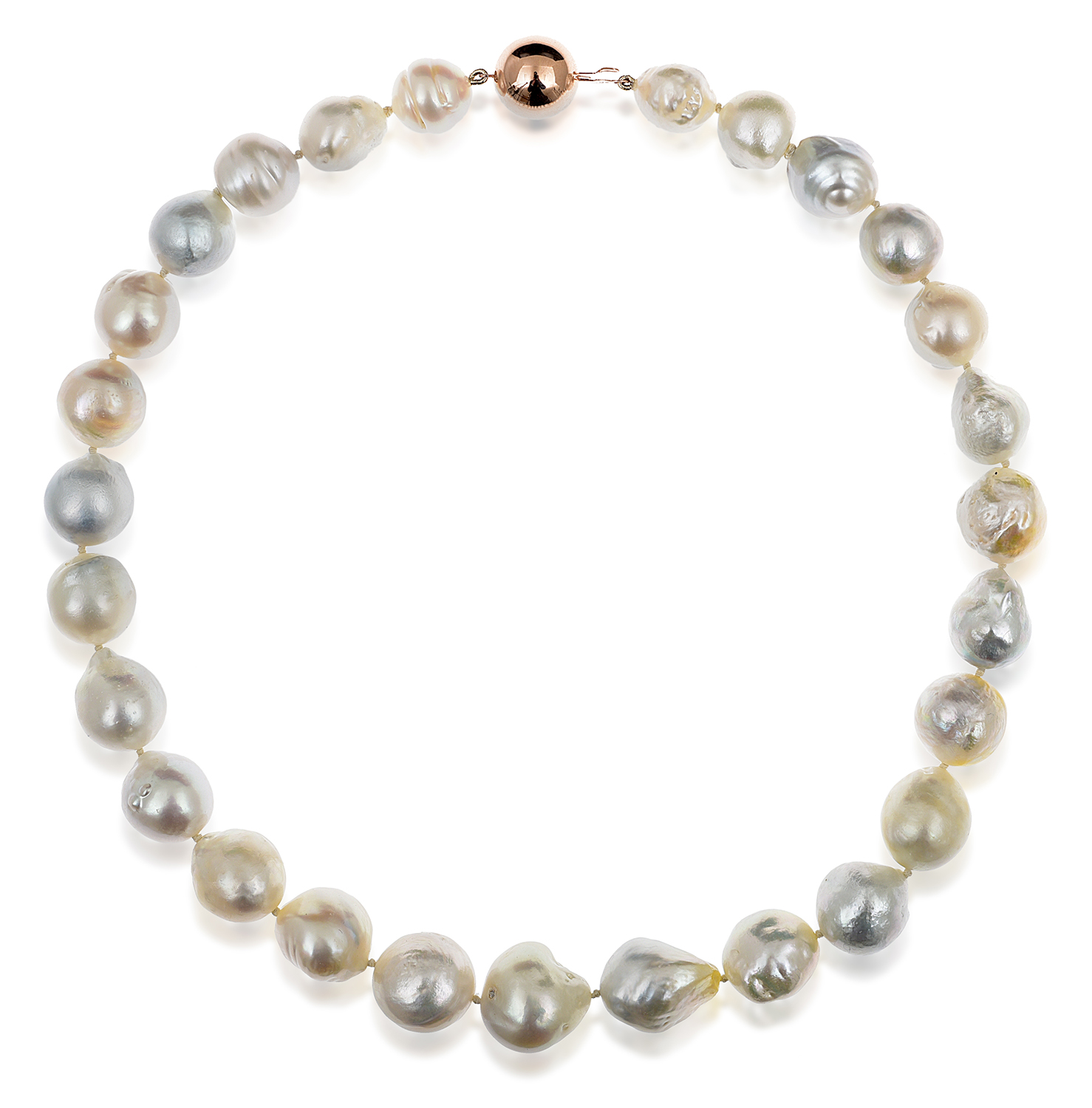 The twenty seven baroque pearls of cream, golden and white hues measuring 12.85mm, to a rose gold polished ball clasp, total length 465mm.