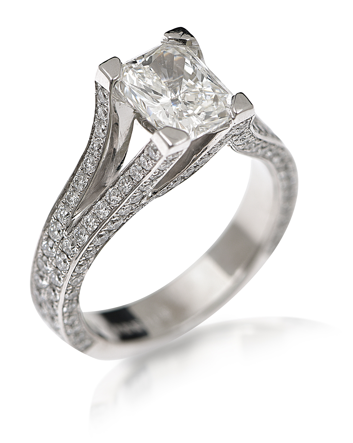 The radiant cut diamond of 1.51cts having further diamond detail to the split shoulders and under bezel, mounted in 18ct white gold, ring size J, accompanied by a GIA certificate stating colour H, clarity SI1.