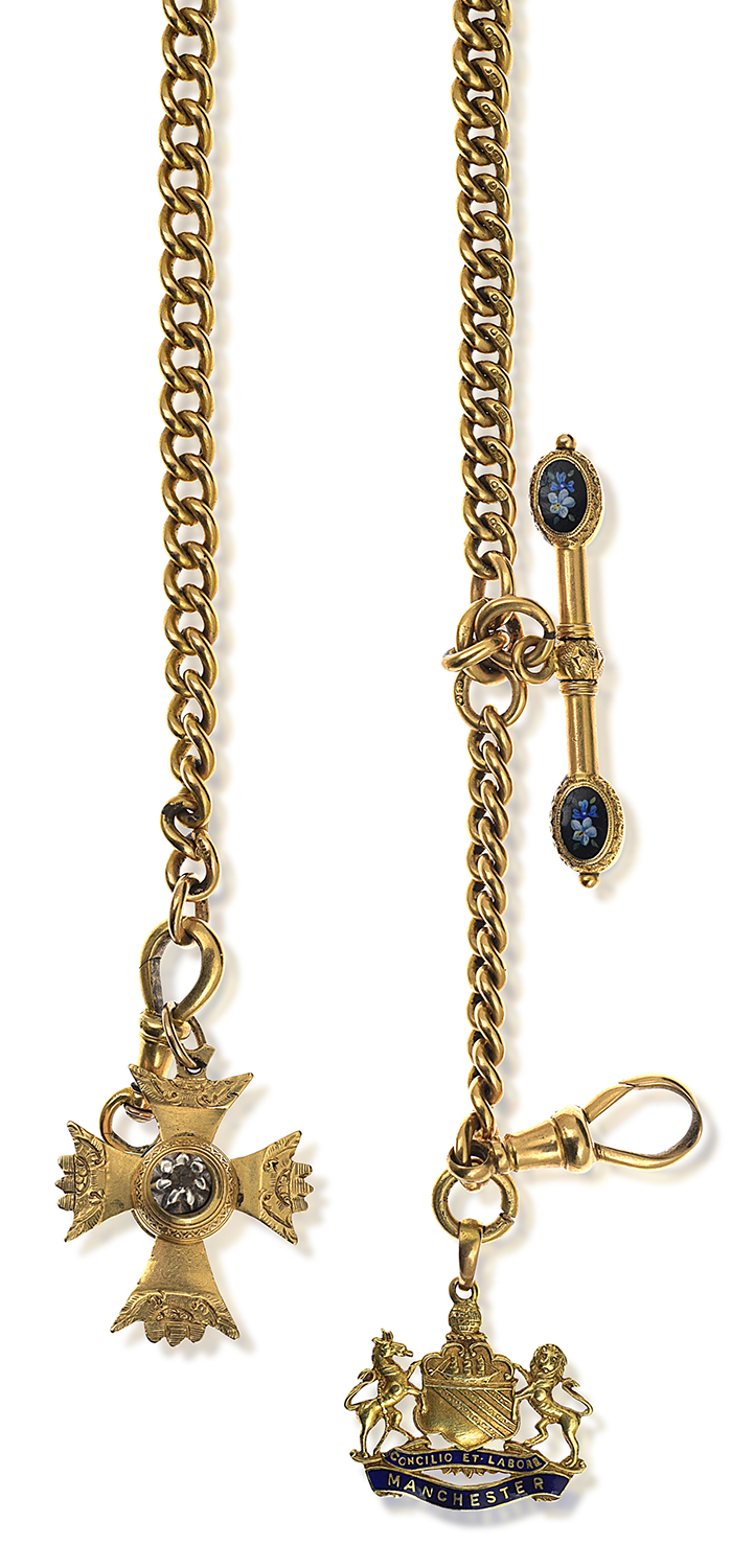 The graduated curb link chain with two swivel clips mounted in 18ct gold, having a gold cased and enamel t-bar, a 14ct gold Maltese cross with enamel and rose cut diamond and a 14ct gold and enamel medallion, total length 540mm.