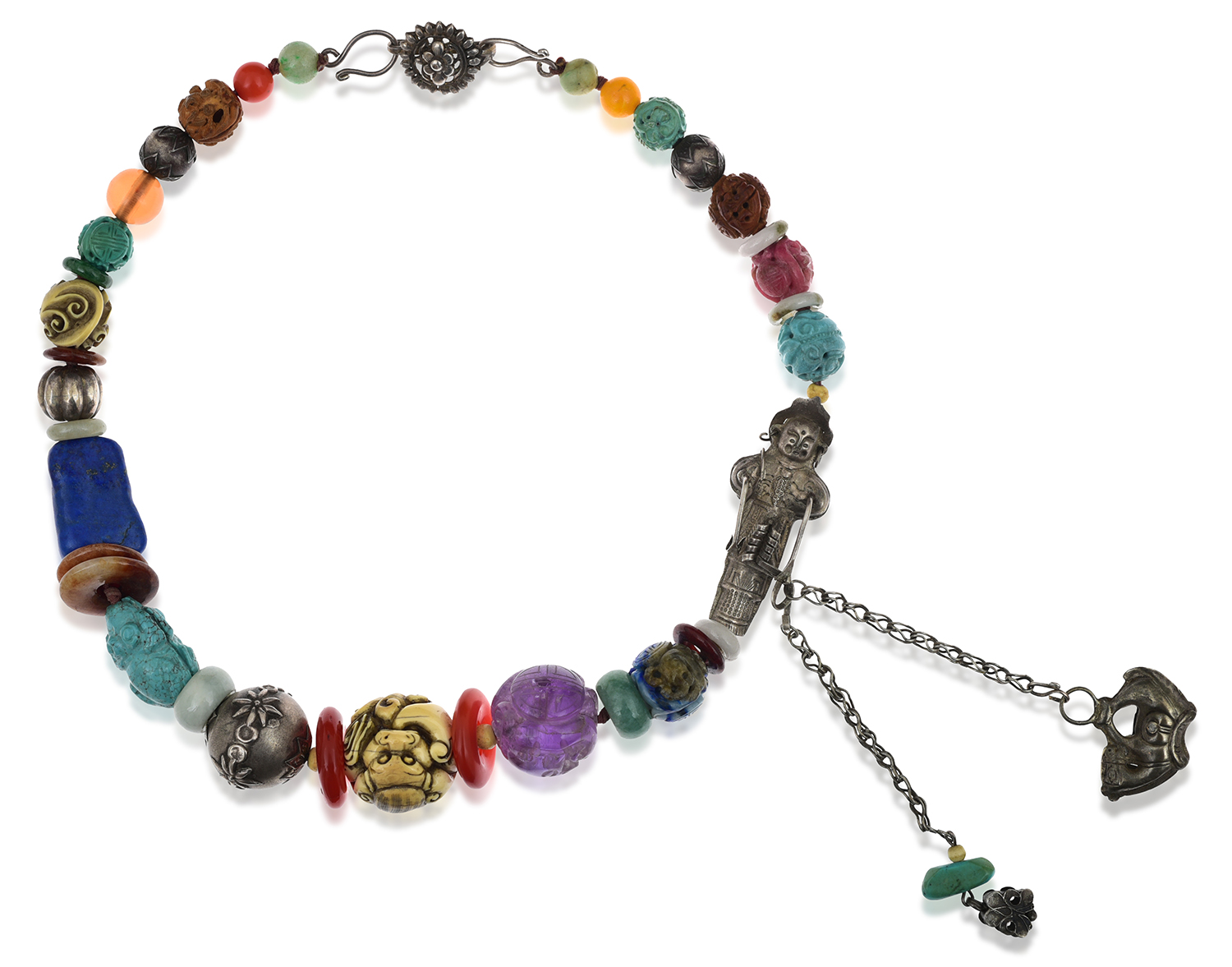 Featuring assorted gem stones including carved amethyst, jadeite, turquoise, carnelian, cinnabar and ivory beads interspaced by chased silver beads and panels, total length 530mm.
