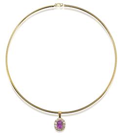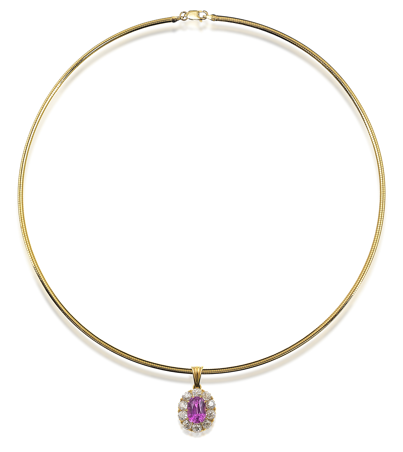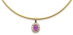 The oval cut pink sapphire of 4.20cts, surrounded by old European cut diamonds totalling 3.00cts, suspended from an omega chain, all mounted in gold.
