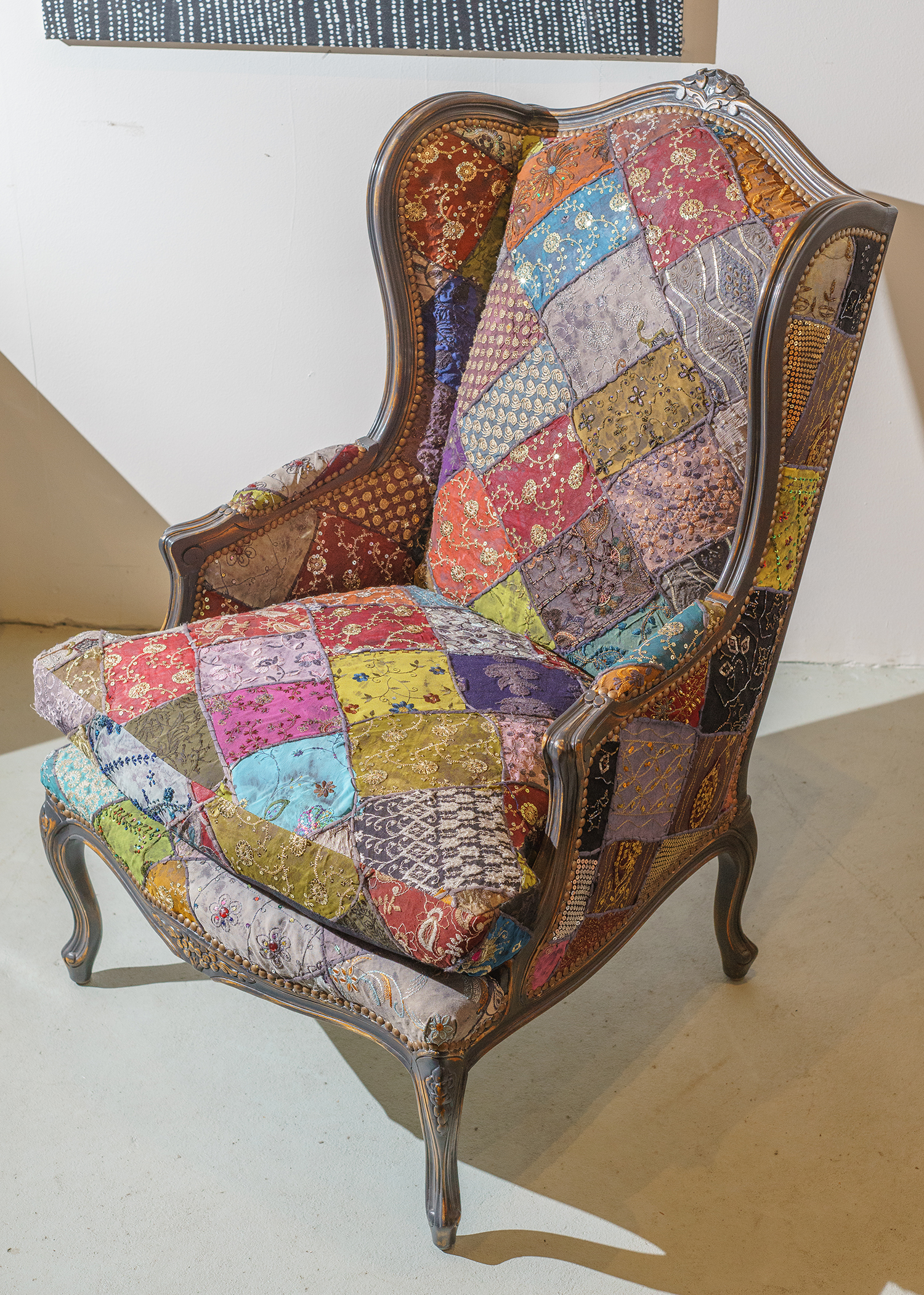 Coloured patchwork fabric, carved detail to frame